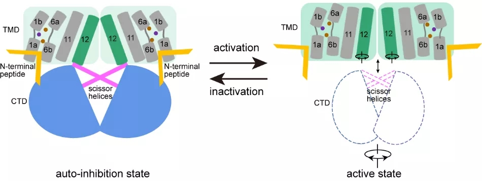 在自抑制状态下,N末端肽段结合在面向胞质的腔中,并将转运蛋白锁定在向内构象中。C末端结构域与N末端肽段相互作用,并稳定这种自抑制状态。随着跨膜螺旋TM12的旋转和平移,N末端肽段与C末端结构域之间的相互作用被破坏,N末端肽段从面向胞质的腔中解离,KCC被激活。
