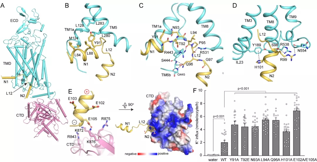 (A) KCC2单个亚基的卡通侧视图。胞外结构域和跨膜结构域用青色表示,N末端多肽用黄色表示,C末端结构域用粉色表示。(B-E)N末端与跨膜螺旋和C末端结构域之间的相互作用;其中(E)显示N2和C末端结构域之间的静电相互作用,分别显示为卡通图(左)以及表面静电势模式(右)。(F)用注射KCC2野生型和突变体cRNA的非洲爪蟾卵母细胞来检测K+内流情况。