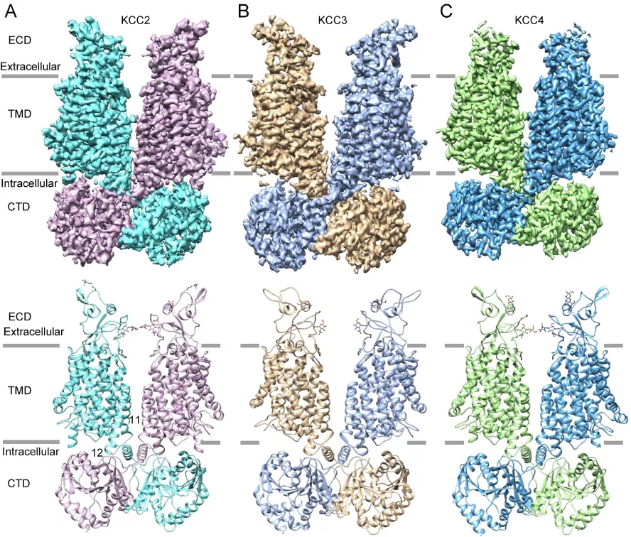 图1. KCC2,KCC3和KCC4的二聚体结构。