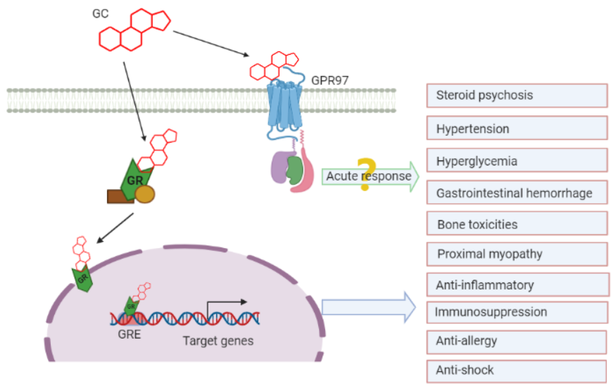 糖皮质激素是机体内极为重要的一类调节分子,它对机体的发育、生长、代谢以及免疫功能等起着重要的调节作用,是机体应激反应最重要的调节激素,同时也是临床上使用最为广泛而有效的抗炎和免疫抑制剂。早在1950年,美国的菲利普·肖瓦特·亨奇、爱德华·卡尔文·肯德尔和瑞士的塔德乌什·赖希施泰因便因为发现和应用糖皮质激素治疗风湿性疾病而获得了诺贝尔奖。前人大量的研究显示,糖皮质激素具有两种不同的作用模式。其中广为人知的是,糖皮质激素与其核受体结合,在细胞核内调控相关基因的表达而发挥作用,这种作用方式一般需要较长的反应时间,被称为基因组机制。除此之外,研究人员发现,糖皮质激素也能够通过快速反应的方式引起细胞和机体的变化。进一步的研究发现糖皮质激素可以与大脑突触的膜组分结合。这提示我们,糖皮质激素可能存在膜受体。随后的研究显示糖皮质激素的快速反应与G蛋白密切相关,Gi的抑制剂PTX能够抑制糖皮质激素的快速作用。因此,研究人员推测介导糖皮质激素的快速反应过程的膜受体可能是GPCR。然而,一直以来这个猜测未能确证,其快速作用的机制依然成谜。