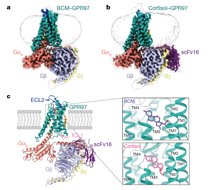 前期的研究表明治疗哮喘药物丙酸倍氯米松(BDP)能够在体外激活GPR97。BDP是糖皮质激素类药物倍氯米松(BCM)的衍生物,在17和21位有两个丙酸的修饰。基于此,团队推测糖皮质激素类化合物可能可以激活GPR97受体。随后研究团队对内源性的类固醇激素进行了系统的筛选,最终发现糖皮质激素类的氢化可的松、可的松(cortisone)以及11-脱氧皮质醇(11-deoxycortisol)能够激活GPR97。进一步的实验表明,氢化可的松能够通过激活GPR97调控Go信号通路。紧接着,团队采用单颗粒冷冻电镜技术分别对外源配体倍氯米松(BCM)以及内源性配体氢化可的松(cortisol)激活的GPR97-Go复合物进行了三维结构重构,最终分别获得了3.1 Å和2.9 Å分辨率的电镜结构(如图1所示)。