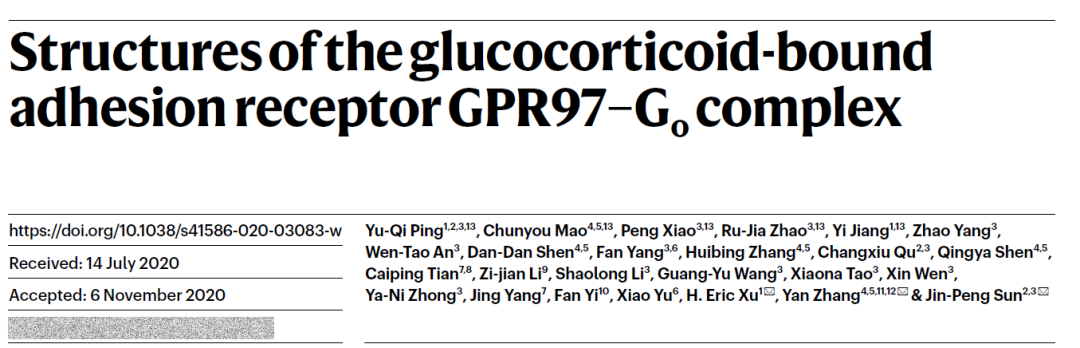 2021年1月7日,437bwin必赢国际官网、浙江省良渚实验室张岩研究员团队,联合山东大学孙金鹏教授团队及中国科学院上海药物研究所徐华强研究员团队合作在Nature杂志上在线发表了最新研究成果“Structures of glucocorticoid-bound adhesion receptor GPR97-Go complex”,首次鉴定并解析了糖皮质激素与其膜受体GPR97结合的复合物高分辨率电镜结构。这同时也是世界上首个解析的黏附类GPCR与G蛋白复合物的结构。