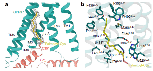 意外的是,分析冷冻电镜密度图发现在Gαo-α5螺旋的C351位点存在棕榈酰化修饰(如图2所示)。这是目前首次在GPCR-Gi/o复合物结构中发现此修饰。目前学术界普遍认为C351位点的翻译后修饰会导致Gi/o信号通路的功能丧失。而我们这里的功能研究表明,Gα C351位棕榈酰化修饰对黏附受体GPR97的G蛋白偶联及其下游信号转导起到促进作用,颠覆了目前的认知,是对Gi/o信号通路精细调控的重要补充。