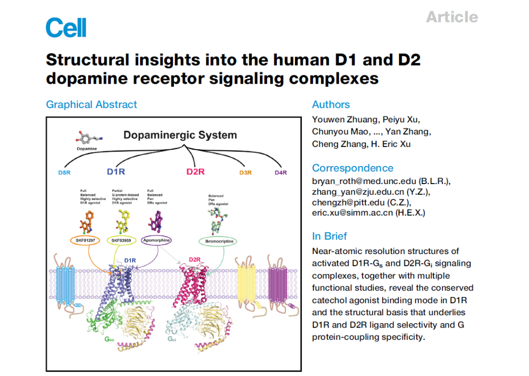 单胺类神经递质是广泛分布在人体内的一类化学信号分子,包括多巴胺(dopamine, DA)、肾上腺素(adrenaline)和五羟色胺(serotonin, 5-HT)等,这些信号分子共同调控人体内包括情绪以及记忆在内的多种生理功能并维持机体内环境稳态。多巴胺作为人体内一种重要的单胺类神经递质,通过多巴胺能神经系统,对中枢神经系统(CNS)以及外周神经系统(PNS)的功能进行调控。多巴胺能信号主要由人体内一类被称为多巴胺受体(dopamine receptors, DRs)的G蛋白偶联受体(G protein-coupled receptor, GPCR)介导,包括D1R到D5R共五个受体成员。按照偶联下游G蛋白种类的不同,这些受体可以进一步分为D1类受体和D2类受体两组。其中,D1类受体包含D1R和D5R,主要与激活型G蛋白Gs偶联,刺激下游第二信使环状单磷酸腺苷(cAMP)的生成,而包括D2R,D3R和D4R在内的D2类受体则主要与抑制性G蛋白Gi/o偶联,抑制cAMP形成。在五种DRs中,D1R和D2R是CNS中表达最为丰富的受体,主要分布在基底神经节和前额叶皮层中 1,2。D1R和D2R介导的多巴胺能信号对于奖赏、认知、运动协调和神经内分泌功能等在内的高级脑部功能至关重要,其发生异常与许多神经精神疾病密切相关,包括阿尔兹海默症(Alzheimer's disease, AD)、帕金森氏病(Parkinson’sdisease, PD)、精神分裂症、认知障碍、注意力缺陷多动症(Attention deficithyperactivity disorder, ADHD)以及药物成瘾和滥用等。作为多巴胺受体家族的代表成员,D1R和D2R是治疗PD以及精神分裂症的热门药物靶点。