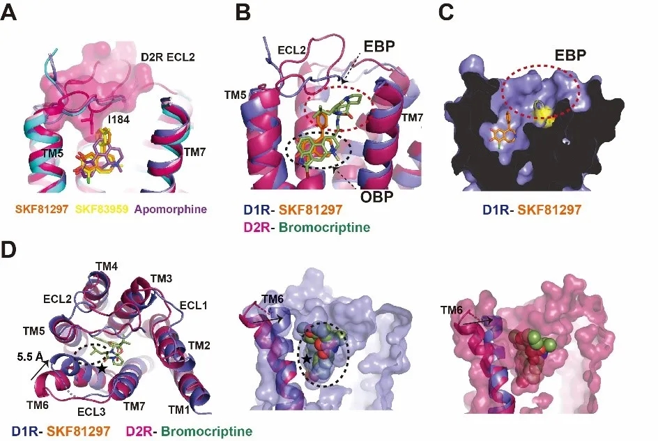 研究人员对比D1R与非选择性激动剂apomorphine的结构发现,apomorphine的结合比SKF化合物更远离D1R的胞外loop 2(ECL2)。进一步比较D1R和D2R的结构,研究团队发现D1R和D2R的ECL2在拓扑结构上存在明显的差别,D2R的ECL2上的“CIIA”基序相比于D1R的“CDSS”基序更为靠近正构结合位点中心,如果SKF化合物和apomorphine以类似的模式结合到D2R,D2R的ECL2,尤其是氨基酸残基I184,将与SKF化合物而不是apomorphine发生空间位阻效应。比较D2R-bromocritine的结构发现,bromocriptine远离D2R ECL2区域,避免了与之发生位阻效应,这些结果表明ECL2在D1R和D2R的配体选择性上发挥重要调控作用。Bromocriptine在对D1R的结合力上比D2R大概低50倍。通过D1R和D2R的结构比对发现,D1R的配体结合口袋更为狭窄,相比于D2R,D1R的TM6近胞外端往跨膜中心内移5.5 Å并于bromocriptine发生一定程度空间位阻,D1R上的非保守的带正电氨基酸K81也在能量上不利于和bromocriptine的结合,这些因素共同决定了bromocriptine对D2R更高的亲和力(图2)。