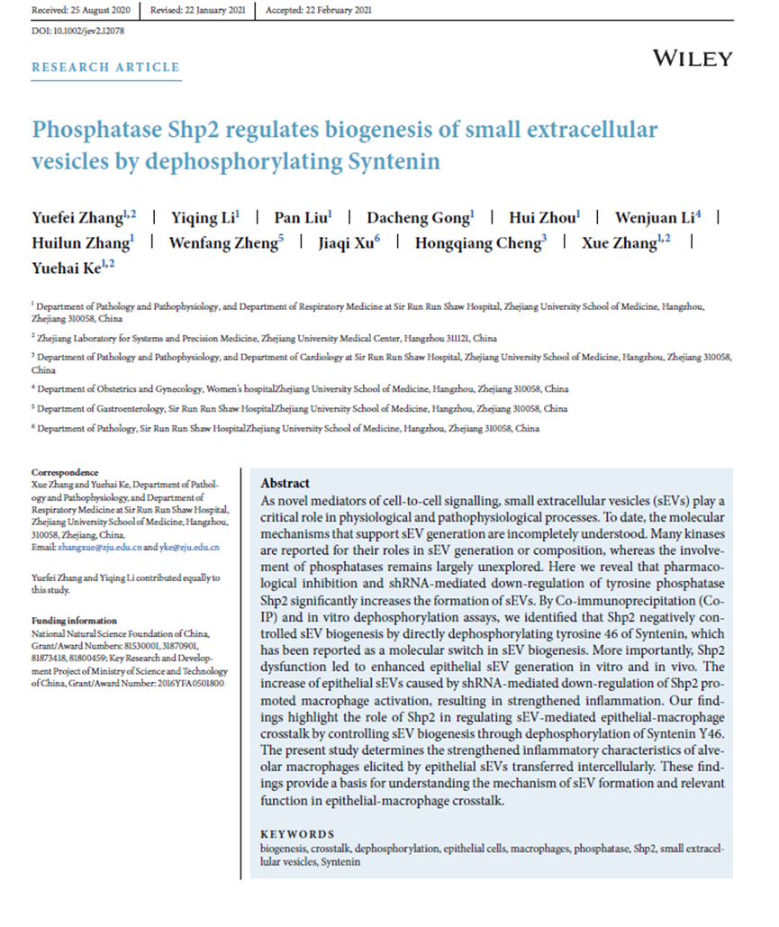 2021年3月10日,437bwin必赢国际官网柯越海教授团队在Journal of Extracellular Vesicles杂志在线发表了题为“Phosphatase Shp2 regulates biogenesis of small extracellular vesicles by dephosphorylating Syntenin”的研究论文。该研究发现一组酪氨酸磷酸酶调控细胞外囊泡(extracellular vesicles)的合成与分泌,阐明了其中的磷酸酶PTPN11/Shp2通过去磷酸化修饰负向调控肺泡上皮细胞外泌体的生成,提示了磷酸酶参与肺部炎症微环境的新的作用途径。
