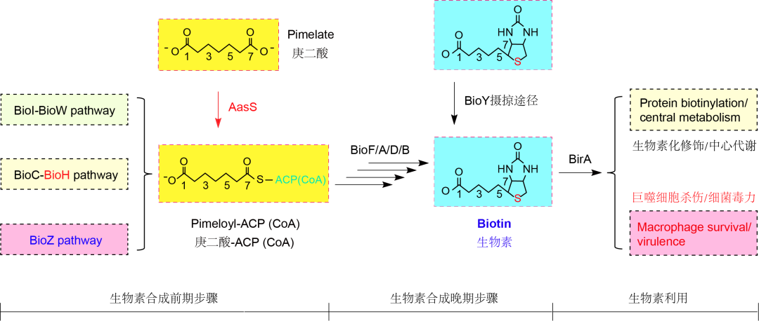 生物素(维生素H或辅酶R),结构上属于一类具有7个碳原子骨架的含硫脂肪酸衍生物。在生物体内,生物素多以蛋白修饰的形式存在,参与糖、蛋白质和脂肪酸在内的系列重要代谢过程。从能量消耗的角度而言,生物素亦是一类高耗能的生物小分子,因此其合成途径通常受到精密的调控。这一点,在分枝杆菌的研究中得到了证实。该课题组揭示了BioQ执行蛋白所负责的生物素感应机制(MM,2014a & MM,2018)。通常而言,只有植物、真菌和一些细菌(包括病原细菌)具备生物素的合成能力,而哺乳动物在进化中丧失了该能力,只能依赖肠道菌群的从头合成或从食物中摄取该微营养因子。鉴于病原细菌的生物素代谢过程对其致病机制至关重要,近年来“生物素作为限制性/营养性毒力因子”这一科学假说得到了学术界的广泛认同。在结核分枝杆菌领域,生物素代谢已被发展为一个潜在的抗TB靶标。因此,生物素代谢的机制研究,将为缓解当下“病原菌的多重耐药/泛耐药”的这一严峻形势提供独特视角/解决方案(图1)。