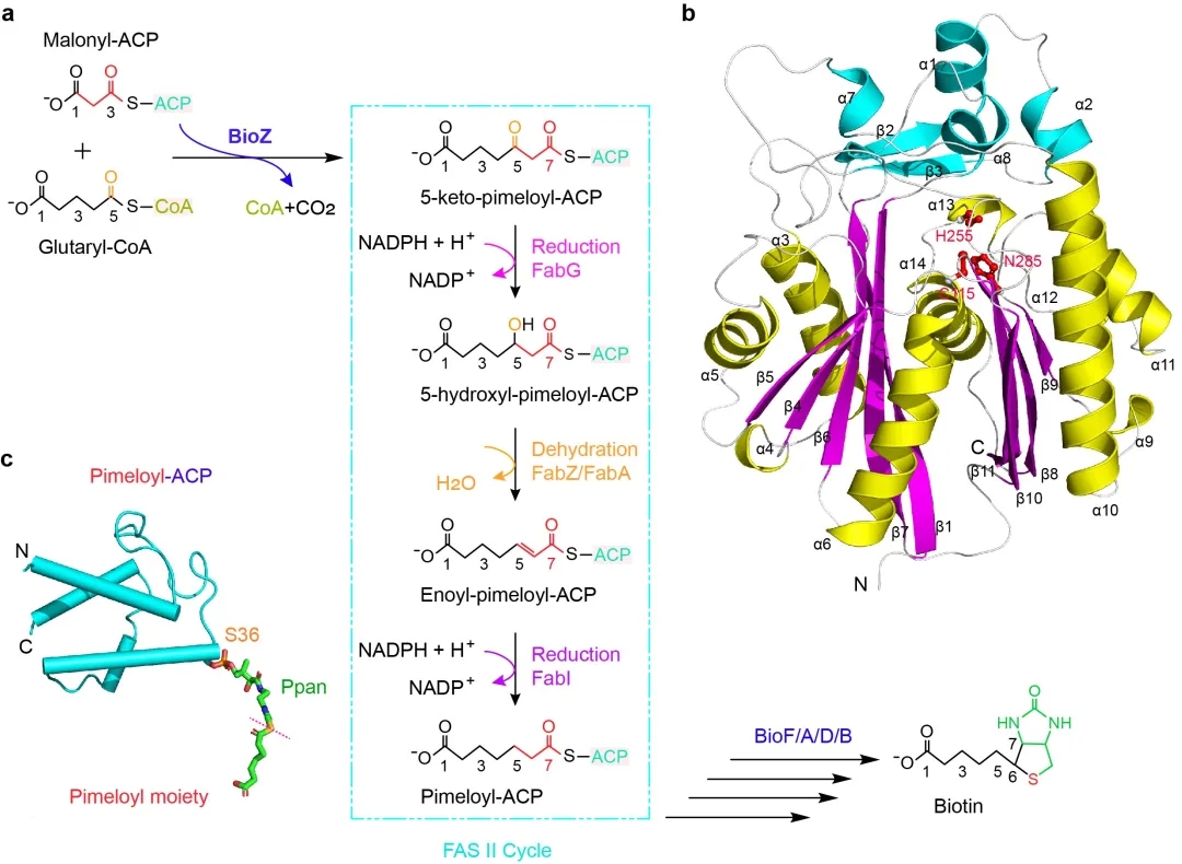a. BioZ生物素合成途径的工作模型; b. BioZ的晶体结构;c.生物素合成前体分子庚二酸单酰ACP的结构示意图