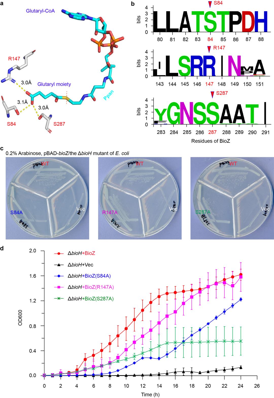 a. 底物戊二酸辅酶A的结合口袋分析;b. 戊二酸辅酶A极性羧基的BioZ中和氨基酸的保守性分析;c-d. BioZ中和氨基酸的功能分析