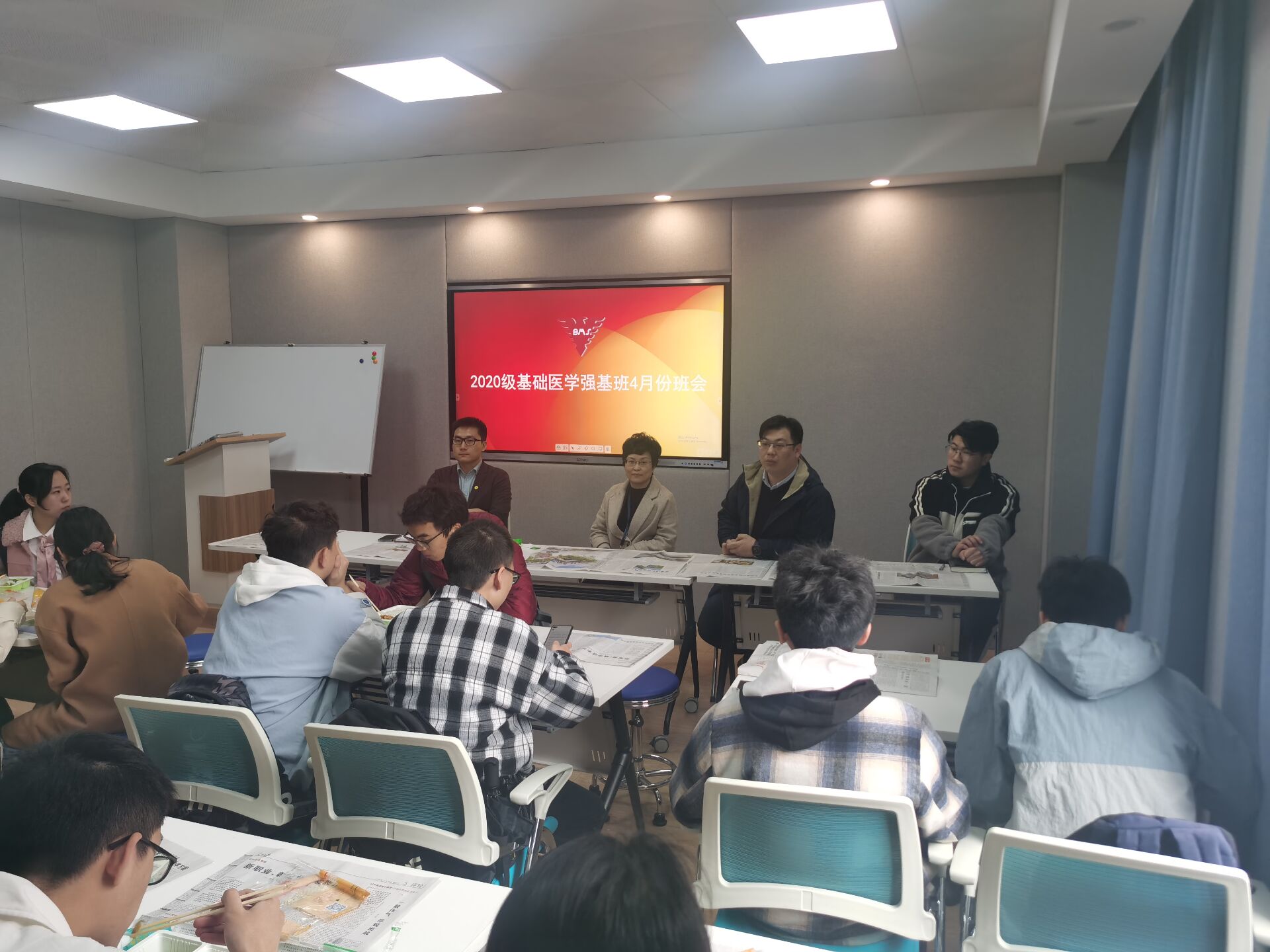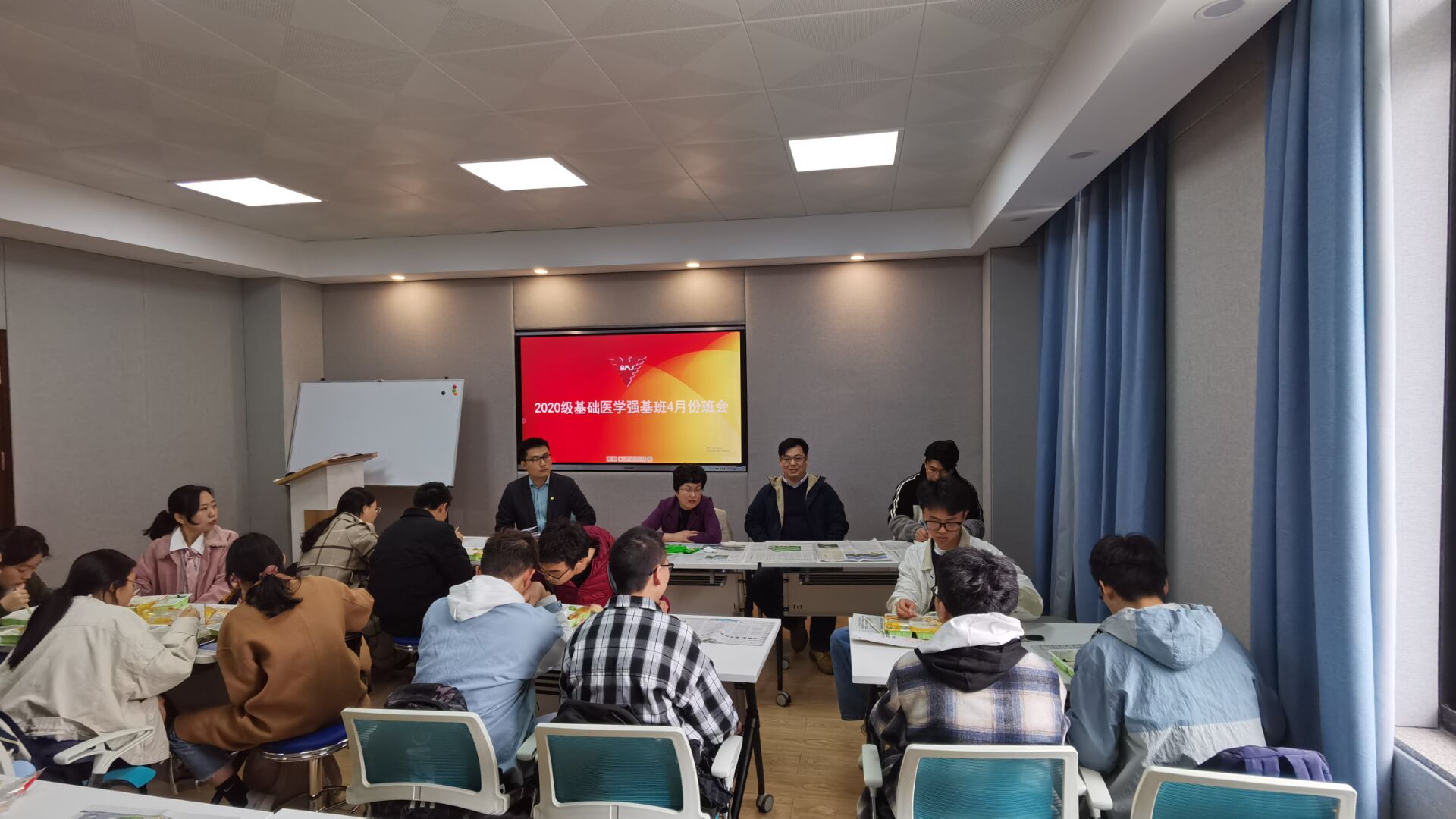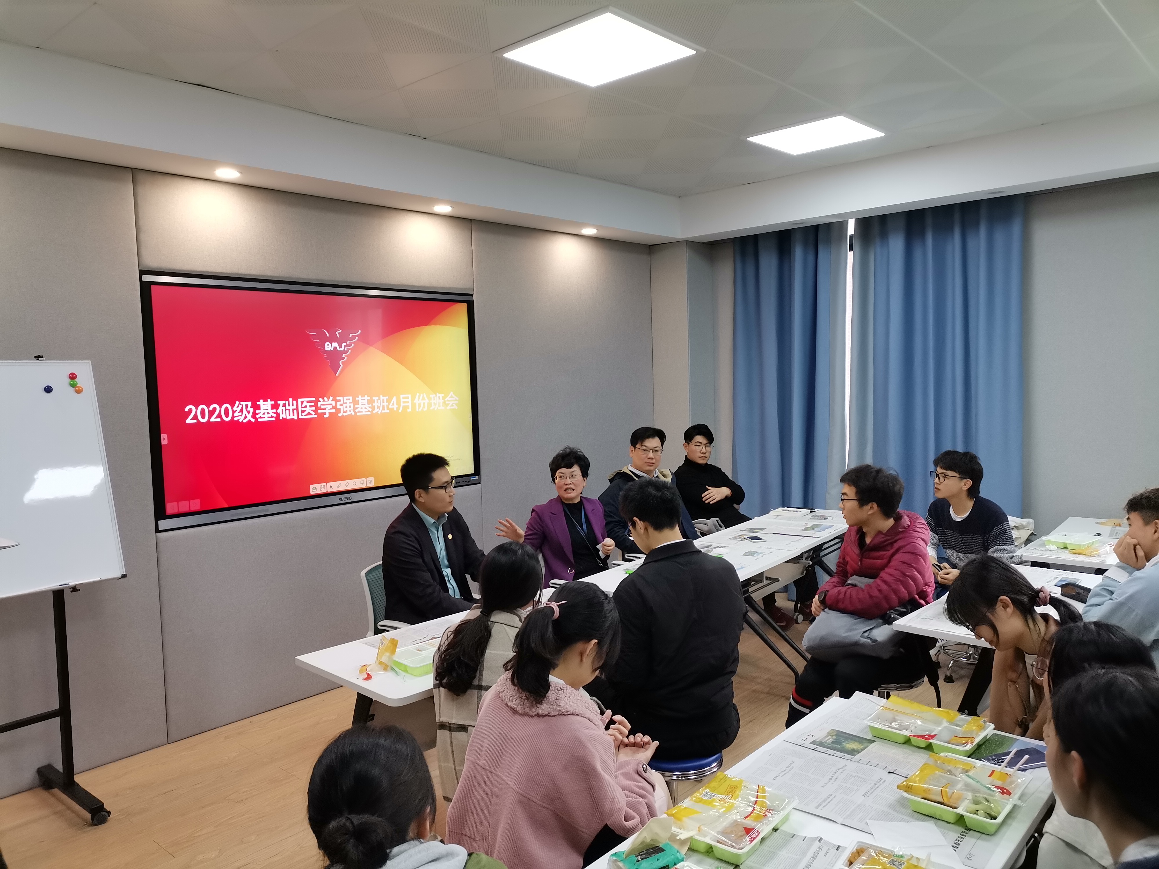 为了解决同学们学习生活中的一些疑惑,明确未来一段时间内的培养方案,王青青、王迪院长于2021年4月8日主持举行强基基础医学2001班班会,班主任张岩、辅导员孙峰柯出席会议,25位同学全部到会。