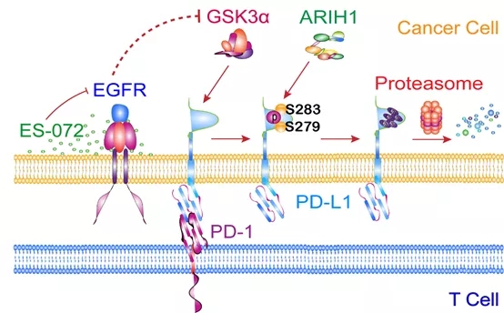 夏宏光团队长期致力于靶向蛋白降解的机制研究和药物开发。在该项目中,他们首先建立了基于PD-L1膜蛋白水平分析的高通量药物筛选模型,并对2000多个FDA批准的药物或候选药物进行了筛选,鉴定了一系列调控PD-L1膜蛋白水平下降的先导化合物,其中包括已经报道的JAK/STAT、PI3K/AKT/mTOR等信号转导通路抑制剂,以及该团队参与研发的第三代EGFR抑制剂ES-072。进一步研究提示,ES-072通过EGFR-GSK3α通路诱导PD-L1蛋白胞内段S279和S283位点磷酸化水平增加,促进PD-L1和ARIH1结合,调控PD-L1通过蛋白酶体降解。