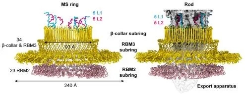 (1)天然状态下内膜环(MS ring)内部存在高度对称错位。内膜环是整个鞭毛马达的组装底座,它不仅可以旋转,而且可以接受来自质子泵和胞质区环传来的扭矩,并将扭矩传给联动杆(rod),而真实状态下MS ring的对称性长期以来具有争议。文章首次证实了天然状态下MS ring内部存在高度对称错位,其上部β-collar和 RBM3区具有C34的对称性,底部RBM2区采取C23对称性,而顶部伸出10个多肽链(5条L1链和5条L2链)。内膜环底部RBM2区紧紧地卡住分泌转置,β-collar和 RBM3包围分泌转置和联动杆下端。