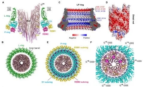 (5)外膜环(L ring)和周质环(P ring)彼此相互紧扣,形成独特的桶状结构。外膜环由26个FlgH亚基组成,具有双层β-桶结构,顶端的α螺旋水平排列形成外膜结合区,而26个FlgH亚基进一步通过N端半胱氨酸上的脂肪基团锚定在外膜上。周质环由26个FlgI单体组成,FlgI单体呈现“V”字形,由D1和RBM1,RBM2三个结构域组成。这三个结构域依次形成了周质环的上、外、下三个亚环结构,彼此相互作用。外膜环和周质环通过FlgH和FlgI单体之间以“1 vs 4” 相互作用方式紧密结合,形成完整的、超稳定的C26对称桶状结构(简称“外膜-周质环”,LP ring),即使在鞭毛解聚后,仍稳定地存在在外膜上。