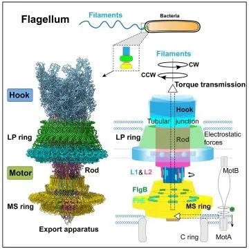 细菌具有这种运动能力是因为拥有独特的运动器官—鞭毛。细菌鞭毛是一个巨大的纳米机器,在结构上由细菌膜上的马达(motor)、胞外的接头装置(hook)和鞭毛丝(filament)组成,横跨细菌的内外膜,延伸到细菌细胞外。鞭毛马达含有质子泵,通过转运氢离子,将化学能转变为机械能。鞭毛马达旋转并将扭矩传输给接头装置,然后传给鞭毛丝,从而带动鞭毛丝的转动。鞭毛丝如同螺旋桨一样,旋转推动细菌向前移动。