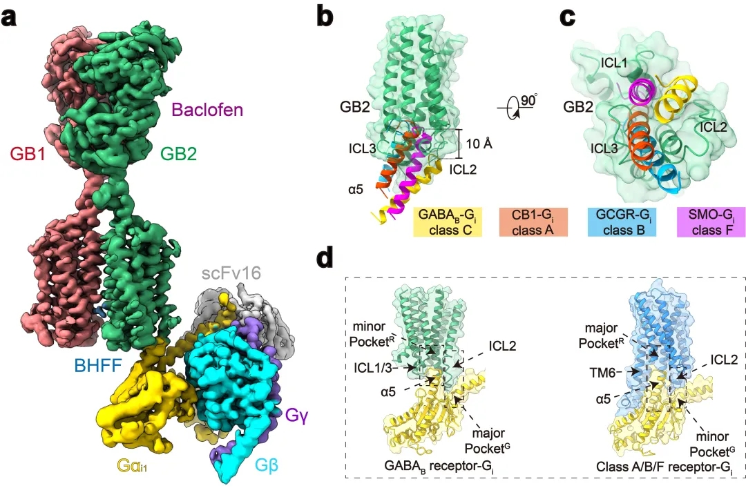 本研究团队在前期工作的基础上再次进行课题攻关,先后突破复合物组装、均一冷冻样品制备、动态构象数据处理等挑战,最终完成高分辨GABAB受体-Gi蛋白复合物的电镜结构鉴定(图1a)。结构分析发现与单体GPCR不同,GABAB受体偶联G蛋白时,两个亚基跨膜域的TM6均没有发生外移,但是GB2亚基的TM3和TM5却发现较小幅度的外扩,使三个胞内环形成一个较浅的口袋结合G蛋白。与单体GPCR相比,G蛋白α5螺旋插入GABAB受体的深度低了~10Å,并且主要与胞内环互作。这些结果结合以前的其他C型GPCR功能研究,推测C型GPCR二聚体都采用了这种不同于A、B1、B2和F类GPCP的激活的独特的G蛋白偶联模式(图1b-d)。