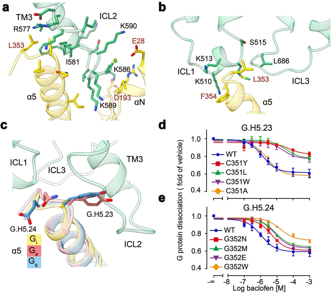 GABAB主要通过3个胞内环偶联Gi蛋白:其中较长的ICL2主要与G蛋白上α5,αN,β2-β3的结合,占据了约80%的互作界面;而较短的ICL1、ICL3主要与G蛋白的α5末端几个氨基酸相互作用,稳定了G蛋白的结合(图3a,b)。此外研究发现GABAB受体选择性识别Gi/o亚型G蛋白是由于Gi/o的H5.23位点是小侧链的半胱氨酸,而Gs、Gq等类型G蛋白的相应位置大侧链的酪氨酸与GABAB受体具有潜在的空间位阻(图3c)。功能实验分析发现,当把H5.23位点的半胱氨酸突变成大侧链的色氨酸后,其偶联G蛋白的能力显著降低,而当突变成小侧链的丙氨酸后,其结合G蛋白的能力没有变化(图3d,e)。