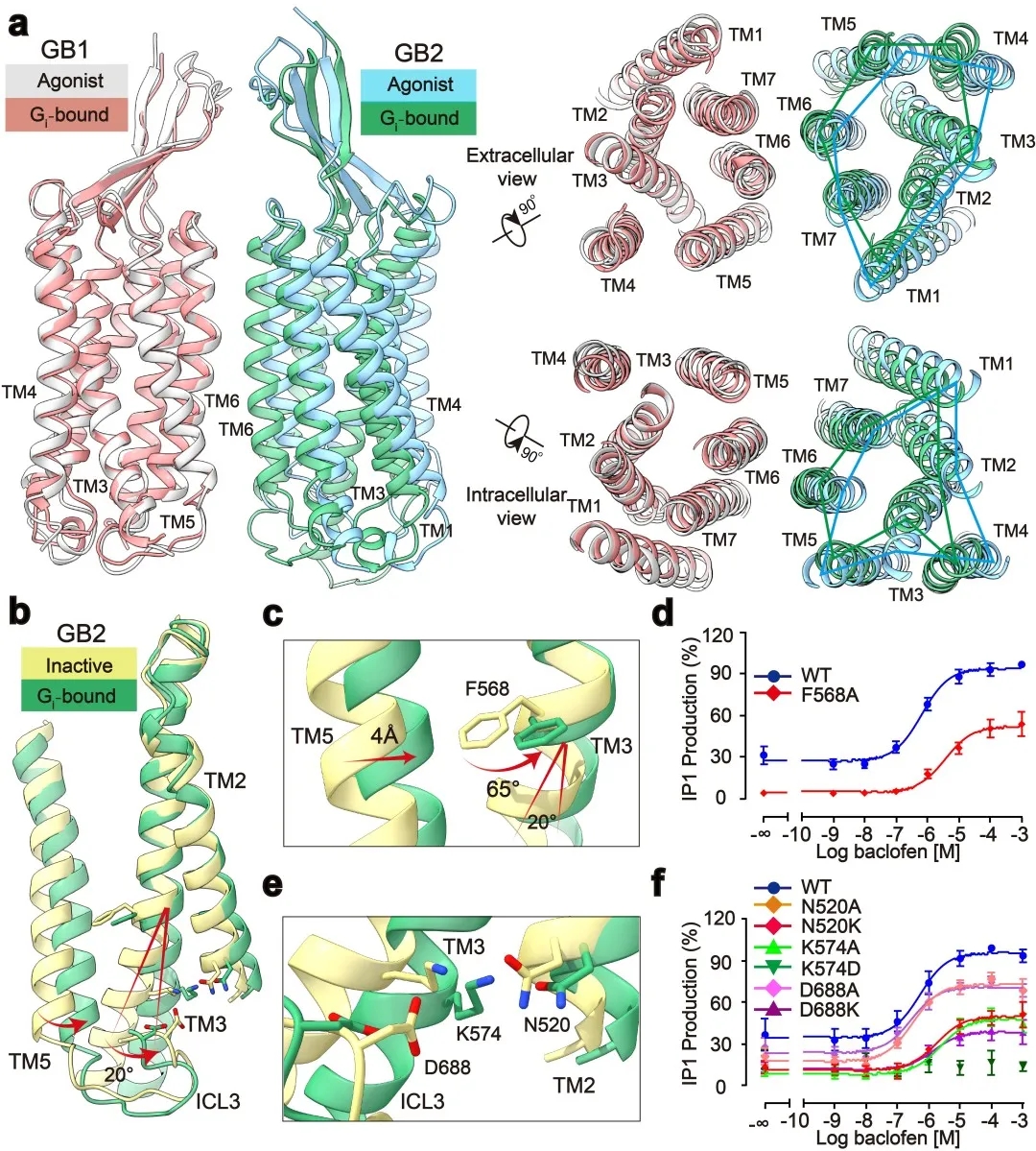 此外,研究发现了GABAB偶联G蛋白后的精细构象变化,包括GB1和GB2之间的旋转,以及GB2亚基TM的细节变化。通过结构分析,研究人员发现结合激动剂的GABAB受体偶联G蛋白后,其GB2-TM相较于GB1-TM产生进一步的逆时针旋转,使得GB1和GB2的跨膜域界面进一步靠近,稳定激活状态。研究人员专注于GB2-TM的内部精细的构象变化,分析发现GB2 TM3/TM5胞内端的构象变化是起始于TM3上F586侧链苯环的大角度旋转。信号转导实验分析发现,将F586突变成小侧链丙氨酸后,受体偶联G蛋白的能力显著下降。此外,在GB2-TM的底部,多个带电荷的氨基酸形成的盐桥进一步稳定了受体的激活态,从而揭示了GB2亚基结合G蛋白的结构基础(图2)。GB2亚基这些独特的构象的变化,最终决定了GABAB偶联G蛋白的非对称性激活模式。