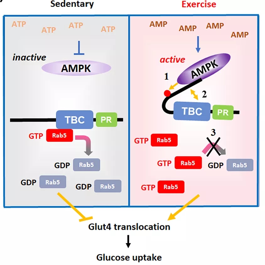 随着人口老龄化以及饮食习惯的改变,糖尿病等代谢性疾病的发病率越来越高。鉴定调控葡萄糖吸收的重要信号蛋白,并阐明相关的调控机制,对防治代谢紊乱疾病具有重要意义。小G蛋白Rab5是影响葡萄糖转运体上膜,促进葡萄糖吸收的重要蛋白之一。团队课题组2020年发表在Cell Death and Differentiation上的文章揭示了Rab5在促进肌肉再生方面的重要功能。在此基础上,课题组发现运动会通过细胞内感受能量变化的分子AMPK,来促进Rab5的活性,并鉴定出TBC1D17是Rab5的新上游负调控因子。借助生物信息学及生化手段,课题组解析出AMPK磷酸化TBC1D17的关键位点是第257位的丝氨酸。重要的是,AMPK介导的这一Ser257位点磷酸化会促进TBC1D17的分子内互作,从而增强TBC1D17 的自我抑制作用,达到激活Rab5及促进Glut4转运上膜的效果。