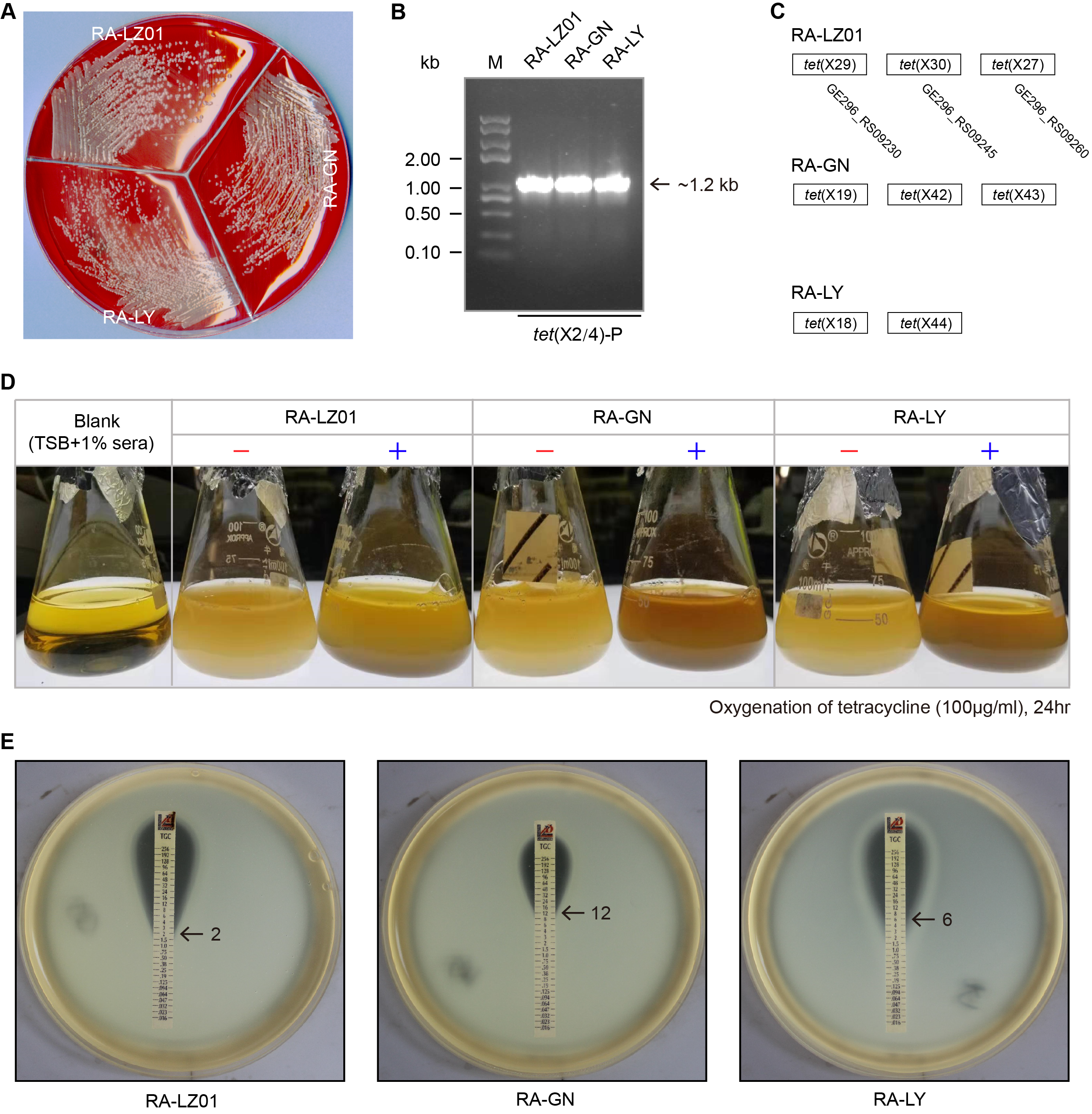 质粒携带的tet(X)耐药基因,编码了黄素依赖单加氧酶,代表了一类替加环素耐药性的新机制。当前,我们对tet(X) 耐药基因的天然来源知之甚少。该研究报道了鸭疫菌来源的26个新变种,其命名依次从tet(X18) 到tet(X44)。这极大拓展了现有的Tet(X) 耐药基因家族。鉴于鸭疫细菌的染色体携带了不同的tet(X)变体,本研究认为该细菌乃tet(X) 的天然宿主。作为Tet(X2)/Tet(X4)的代表性前体基因,Tet(X2/4)-P的表达仅可赋予中度水平的替加环素耐药 (图1)。
