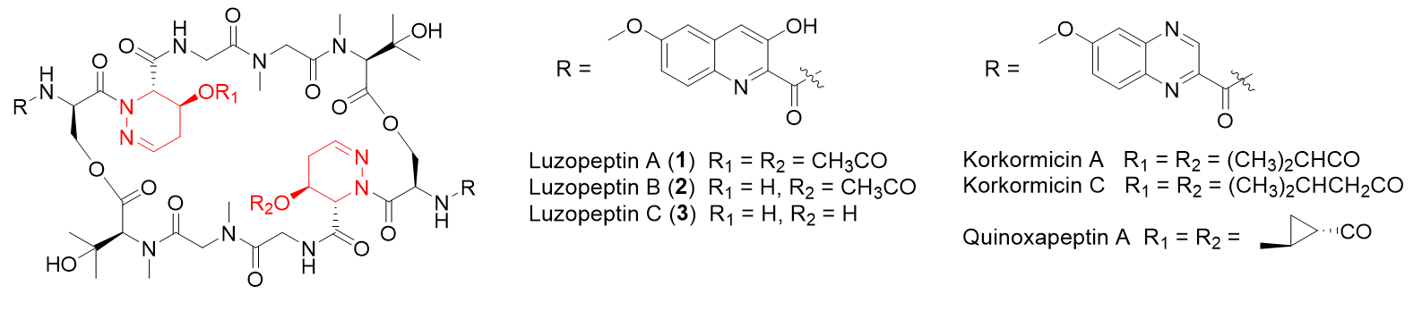 以吕宋肽菌素(luzopeptins)为代表的环酯十肽类(cyclic decadepsipeptides)微生物合成代谢产物具有C2对称性骨架结构。它们能以一定的构象嵌入到DNA双螺旋相邻的两个小沟中,具有良好的抗菌、抗肿瘤、抗病毒活性。前期研究已发现,吕宋肽菌素分子结构中的4-羟基-2,3,4,5-四氢哒嗪-3-羧酸(4-OH-Thp)结构单元是关键的药效团,其4-羟基上的乙酰化修饰对吕宋肽菌素生物活性起决定性作用。例如,双乙酰化的吕宋肽菌素组分A的抗肿瘤、抗菌活性最强,但抗病毒活性最弱,而去乙酰化的吕宋肽菌素组分C抗病毒活性最强,并且几乎没有细胞毒性。同时,吕宋肽菌素结构中的Thp单元也存在于其他的一些非核糖体肽类天然产物中,其稀有腙基(hydrazone)上的碳氮双键(C=N)可以引发肽链的β-转角结构,因此Thp也是一种很有应用前景的肽链结构砌块。然而,长期以来,吕宋肽菌素的生物合成机理,特别是Thp单元中腙基形成的生化基础一直是一个谜。