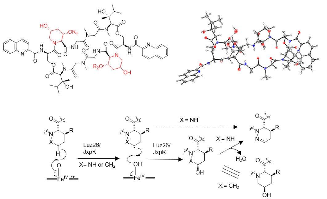 另外,鉴于C-N键的去饱和反应对于P450家族来说是非常稀有的反应类型,研究者进一步对其催化机理进行了探究。通过以P450酶Luz26为指导的数据库挖掘,研究者在江西伦茨氏菌(Lentzea jiangxiensis)的培养物中发现了一系列含哌啶酸结构单元的吕宋肽菌素类似物(江西肽菌素)。对该菌中Luz26的同源蛋白JxpK进行一系列体内与体外实验结果提示Luz26催化的C-N去饱和反应可能是先羟化后脱水的催化机理。
