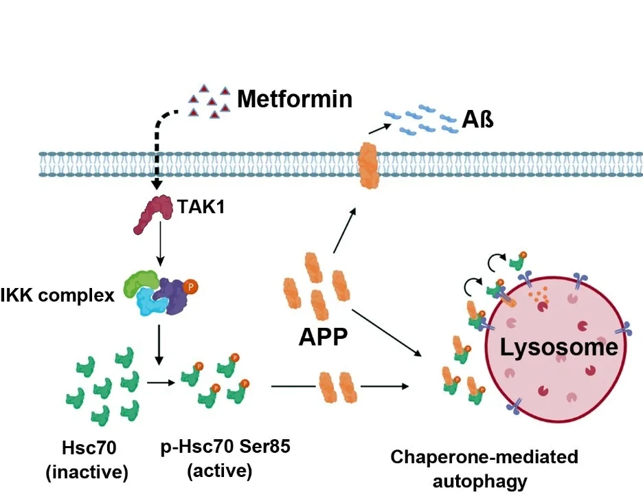 2021年7月21日,437bwin必赢国际官网/良渚实验室夏宏光团队在Protein & Cell 期刊在线发表题为“Metformin activates chaperone-mediated autophagy and improves disease pathologies in an Alzheimer disease mouse model”的研究论文。该研究通过高通量药物筛选鉴定,二甲双胍是一种新型的CMA诱导剂;首次揭示二甲双胍通过TAK1-IKKα/β-Hsc70信号通路诱导CMA的机制;同时,该研究还发现Aβ的前体APP蛋白是新的CMA底物;他们进一步证明,用二甲双胍喂养模式小鼠或者在模式小鼠海马区高表达Hsc70蛋白,可以激活CMA并显著延缓模式小鼠AD病症的进展。该研究提供了一种可马上用于临床的治疗AD的新药物二甲双胍,并揭示了二甲双胍通过诱导CMA治疗AD的新机制。