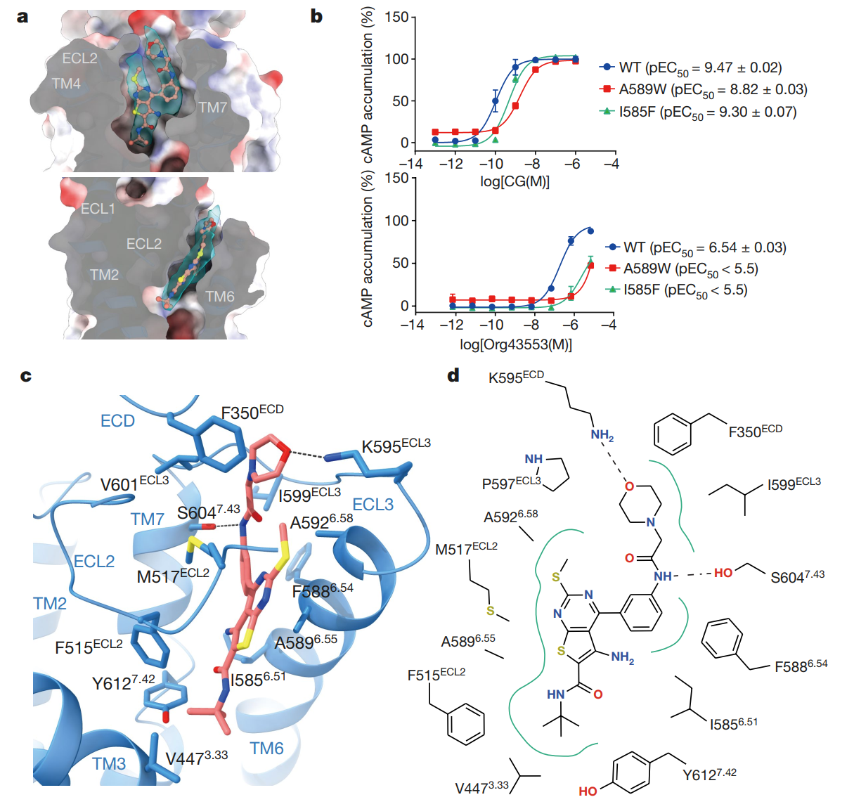 此外,研究人员还揭示了处于1期临床实验中的小分子化合物Org43553与LHCGR精细的相互作用模式,鉴定了Org43553的结合口袋,为临床开发针对糖蛋白激素受体的选择性小分子化合物,替代激素治疗提供了结构模板。