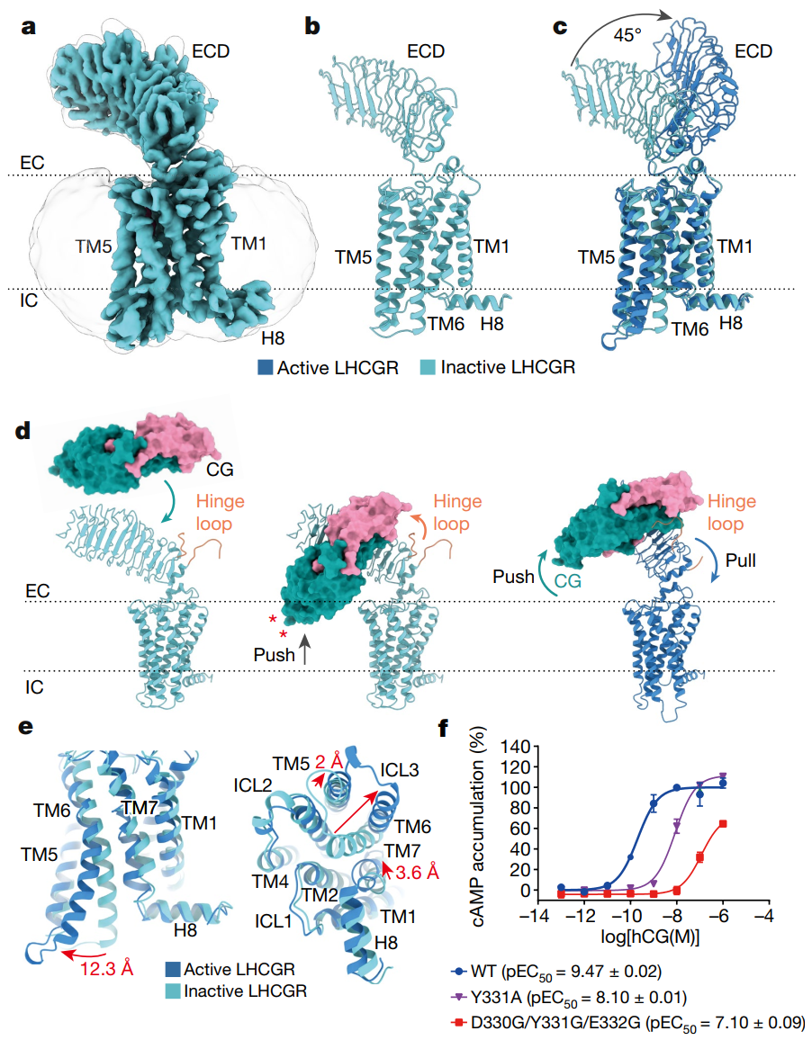 为进一步揭示LHCGR的激活机制,研究团队通过大量尝试,最终解析了全长LHCGR处于非激活状态下的电镜结构,分辨率达3.8Å。这也是目前首个报道的全长单体GPCR的电镜结构。通过受体非激活以及激活构象的对比分析,研究人员发现受体激活时ECD部分发生了~45º的偏转,进一步通过结构分析和功能试验验证,最终提出了LHCGR受体“push and pull”的结构激活模型(图2)。