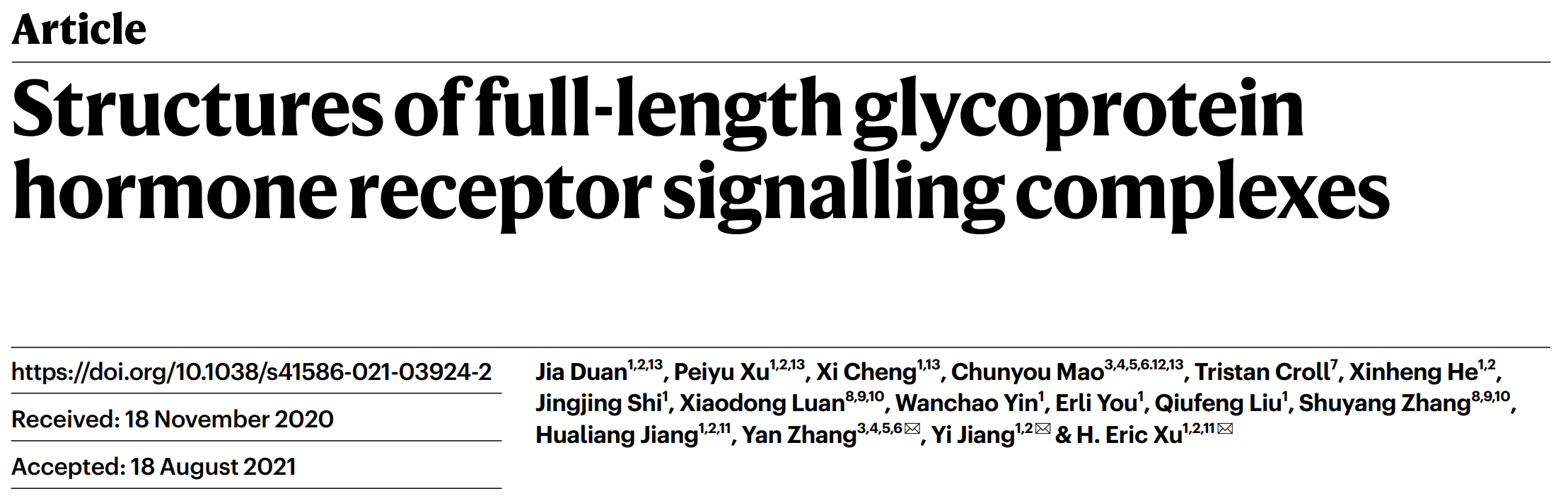 2021年9月22日,437bwin必赢国际官网/良渚实验室张岩研究员团队联合中国科学院上海药物研究所徐华强/蒋轶团队,共同在Nature杂志上发表了最新研究成果“Structures of full-length glycoprotein hormone receptor signaling complexes”,首次解析了全长LHCGR处于非激活以及多种激活状态下共四个结构。该工作揭示了CG与LHCGR相互作用的细节模式,阐明了受体从非激活状态到激活状态的构象变化,提出了激素配体激活受体的结构模式图,并进一步揭示了处于1期临床实验的小分子化合物Org43553与受体LHCGR相互作用细节模式,为临床开发替代激素治疗的小分子药物提供结构依据。