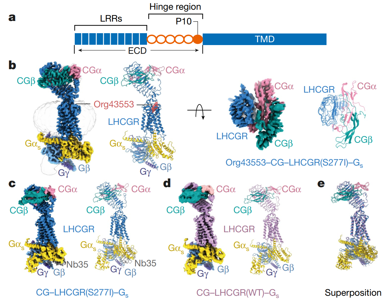 图1.糖蛋白激素受体LHCGR与CG和Gs蛋白复合物的冷冻电镜结构。