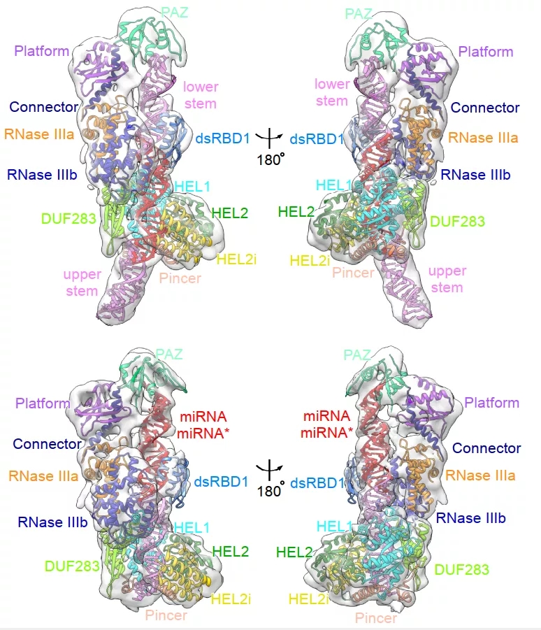 2018年,Cell杂志报道了人类Dicer-pre-miRNA复合物的冷冻电镜结构(Liu et al., 2018)。出乎意料的是,结构中pre-miRNA远离RNase III活性中心,暗示其并非切割状态的结构。通过比较DCL1-pre-miRNA和Dicer-pre-miRNA的结构发现,DCL1的解旋酶结构域相对于Dicer的解旋酶结构域旋转了67°,因此作者推测Dicer的解旋酶结构域可能会发生巨大的构象变化并像DCL1一样夹住pre-miRNA从而完成切割。