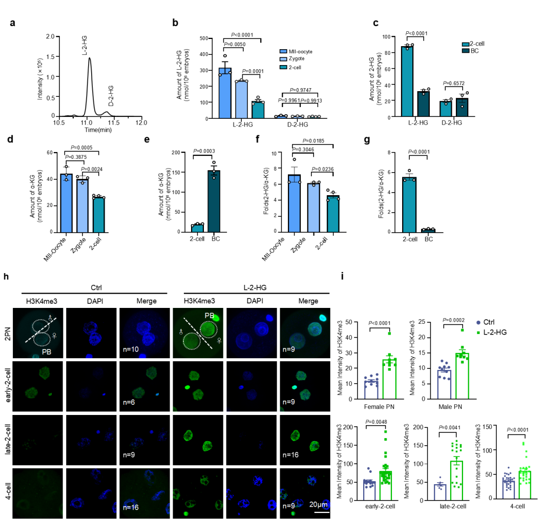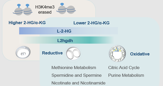 图4 L-2-HG在卵母细胞中大量存在,且其在受精后下降可能参与了早期胚胎发育过程中的组蛋白甲基化擦除的调控。