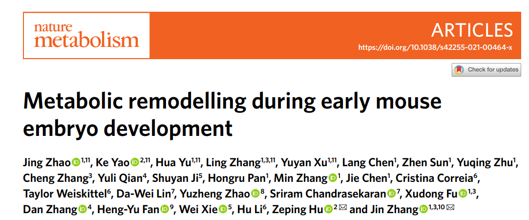 10月14日,437bwin必赢国际官网医学院干细胞与再生医学中心张进课题组与清华大学药学院胡泽平课题组合作在Nature Metabolism上发表题为“Metabolic remodeling during early mouse embryo development”的文章。