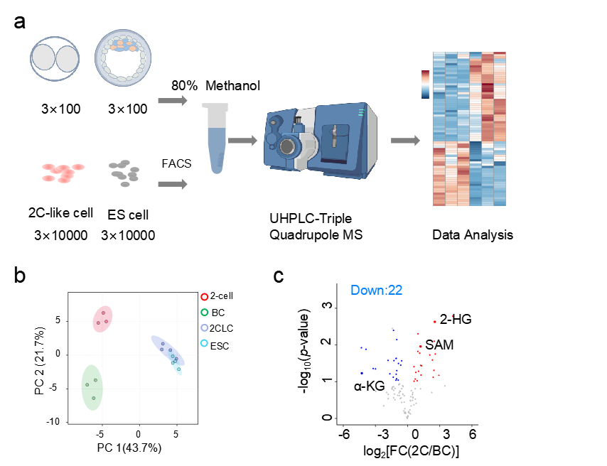 同时,研究人员在此前开发的高灵敏度靶向代谢组学方法的基础上进一步优化代谢组学技术[7],由此鉴定了早期胚胎发育过程中代谢组的动态变化,比较了二细胞胚胎与囊胚的代谢特征。同时研究了体外二细胞样细胞(2C-like cell, 2CLC)与胚胎干细胞(embryonic stem cell, ESC)的代谢特征(图3a)。