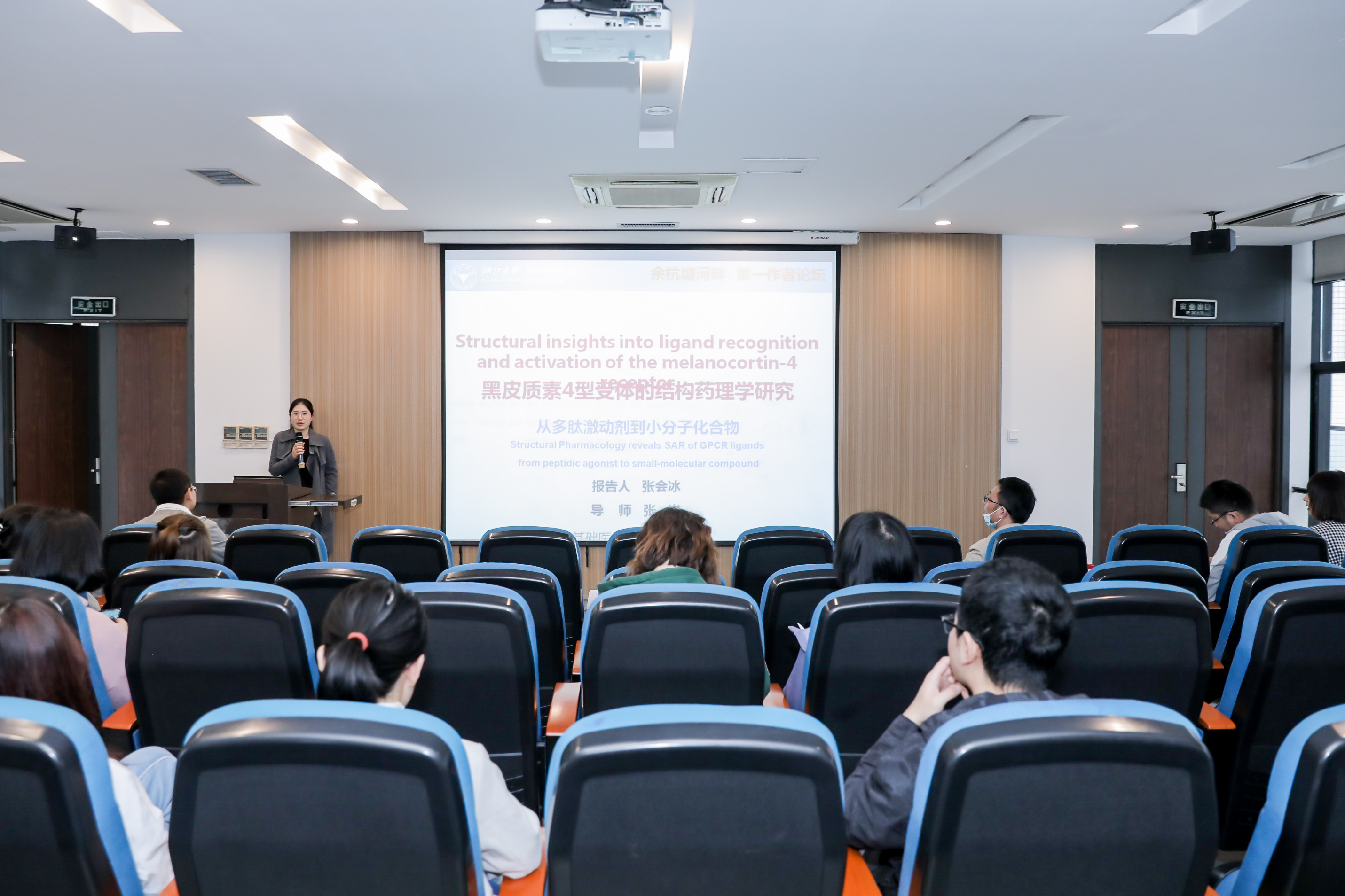 张会冰同学讲述了自己围绕黑皮质素受体4进行的结构与功能研究。在生活中,作为妈妈的她并未因照顾小孩而耽误科研的前进脚步,高效率帮助她很好地平衡了家庭与生活。此外,张会冰同学建议科研过程中要多思考,带着思考去问问题,这样在与导师的交流中也会获得更多启发。
