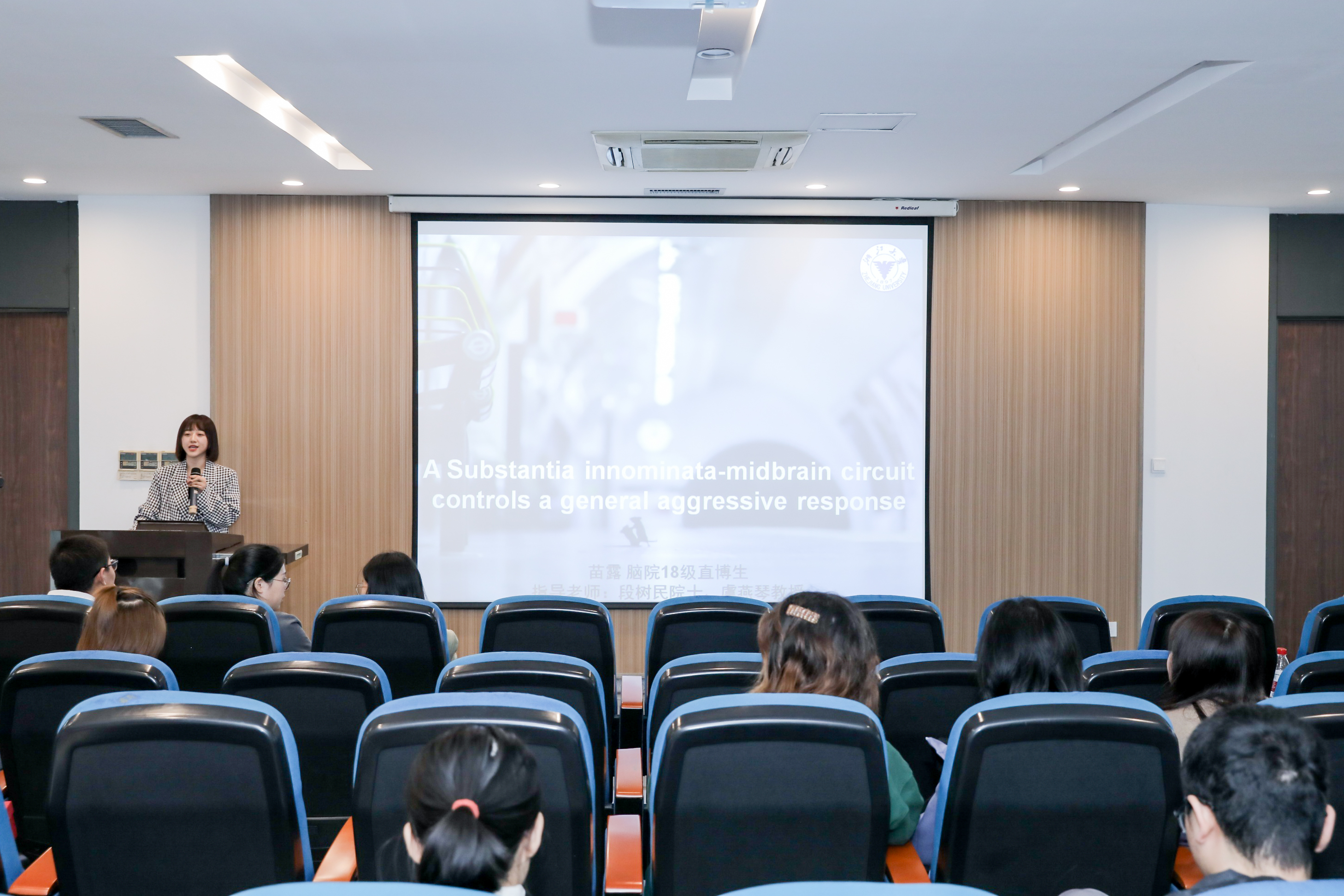 苗露同学分享的是攻击行为的神经环路研究,此项工作集合了多位博士生及硕士生的心血,在投稿期间也遇到了重重困难,经历了长时间的补实验及修改过程,最终文章成功发表在神经科学顶级杂志《Neuron》上。在投稿过程中,多位领域专家的意见也让苗露同学收获了很多,苗露同学告诉大家,要善于交流和讨论,即使是批评的声音,也会有收获。她也鼓励研究生应该培养多方面的能力,多方面发展,而不仅仅局限于实验。