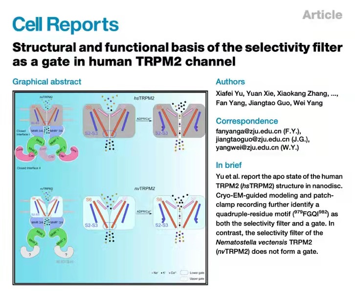 2021年11月,437bwin必赢国际官网杨巍、郭江涛和杨帆团队在Cell Reports杂志在线发表了研究论文"Structural and Functional Basis of the Selectivity Filter as a Gate in Human TRPM2 Channel"。文章鉴定了人源TRPM2通道离子选择性滤器分子结构,并发现其为通道离子通透的上端闸门 (gate),该研究为阐明TRPM2通道的门控机制以及以TRPM2通道为靶标的药物研发提供了新的分子基础。