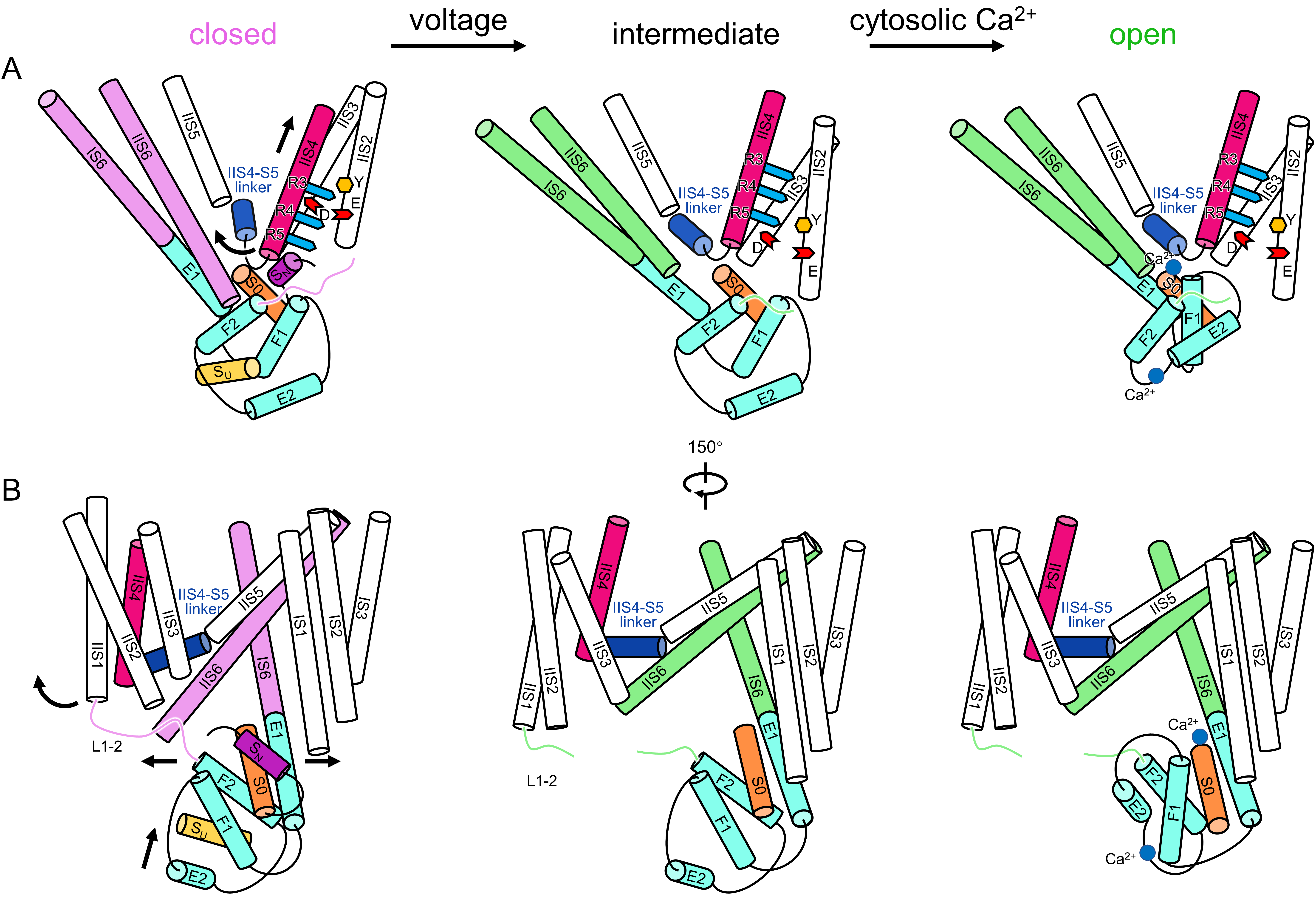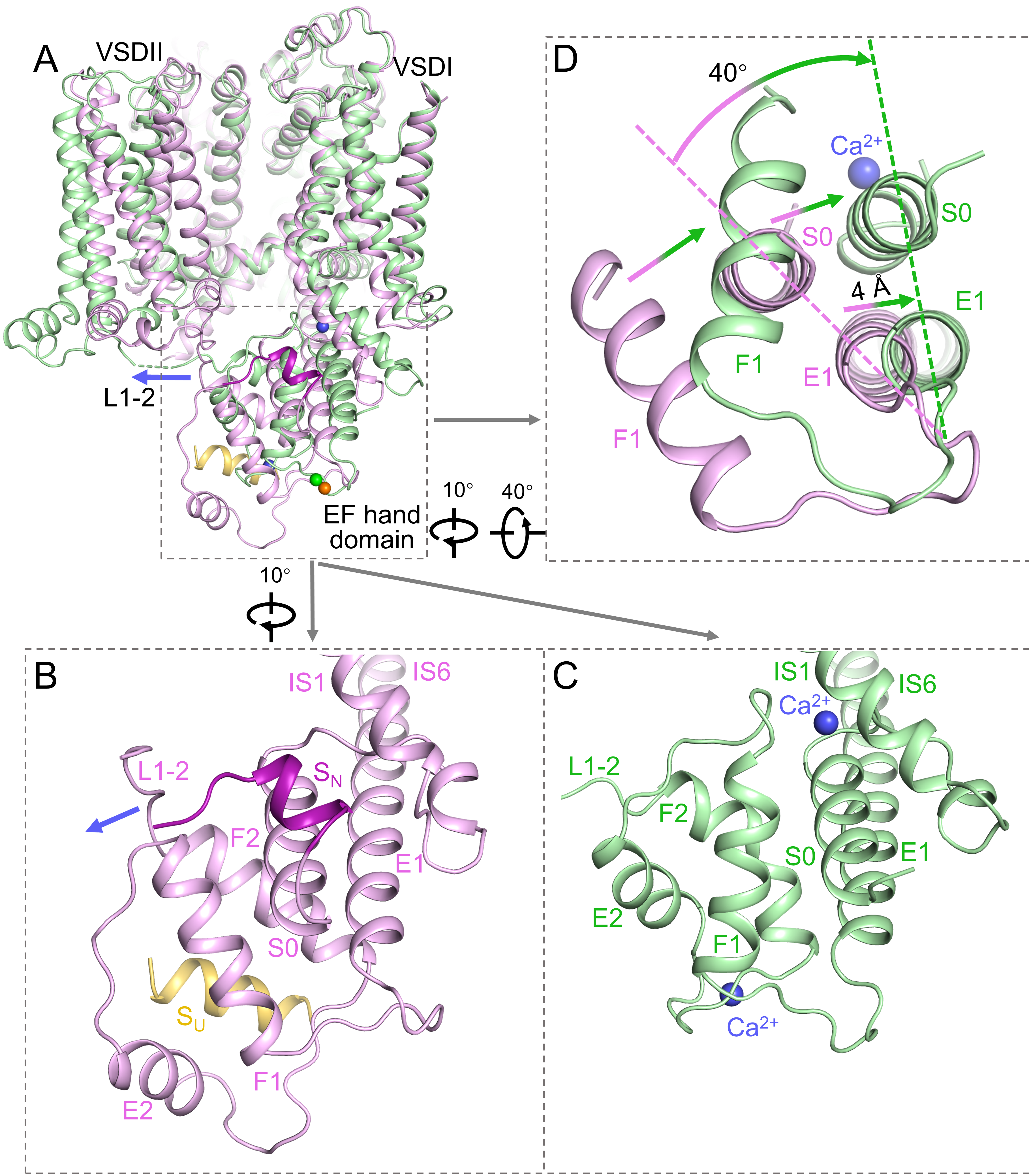 (3)电压门控和细胞内钙离子激活的偶联机制:研究者发现,在VSDII抑制的情况下,高浓度(50 mM)钙离子也无法激活EF hand;但是一旦VSDII被激活,低浓度(1 mM)钙离子就可以激活EF hand。因此膜电位去极化激活VSDII与钙离子激活EF hand是偶联的,并由L1-2,SU和SN介导(图4)。