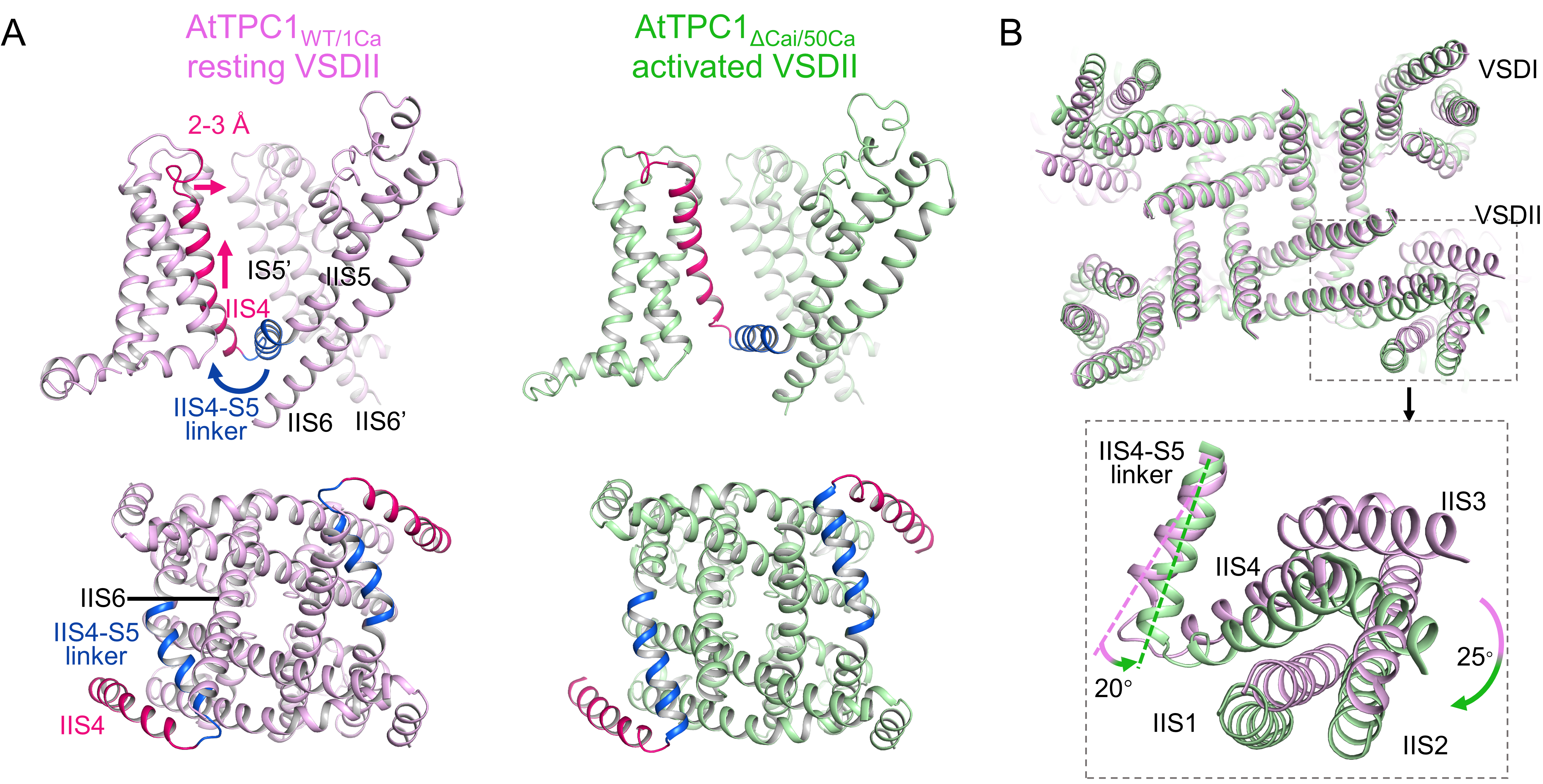 A,AtTPC1电压激活过程中发生IIS4垂直平移以及IIS4-IIS5 linker旋转。B,AtTPC1的VSDII发生旋转。AtTPC1野生型和突变体模型分别用粉色与绿色显示。