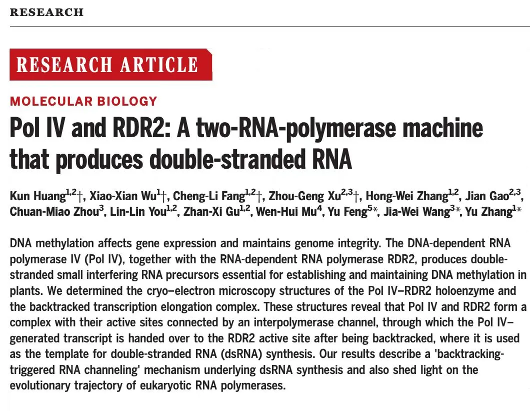 2021年12月24日,中国科学院分子植物科学卓越创新中心张余研究团队和王佳伟研究团队以及437bwin必赢国际官网冯钰团队合作在《科学》上发表题为“Pol IV and RDR2: A two-RNA-polymerase machine that produces double-stranded RNA”的研究论文,该研究首次解析了植物Pol IV的结构,揭示了植物Pol IV-RDR2两种RNA聚合酶组装成的独特复合物构造,并提出了Pol IV-RDR2以底物内部传递的机制实现双链DNA为模板合成双链RNA。