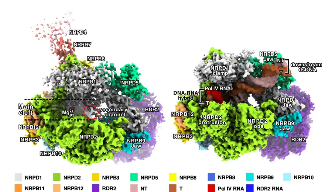 Pol IV-RDR2全酶的复合物结构(左)以及Pol IV-RDR2 转录延伸复合物(右)的三维结构