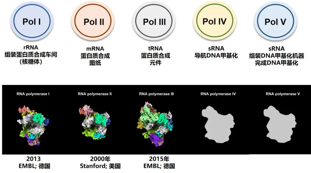 Pol IV和Pol V作为真核生物的第四个和第五个多亚基RNA聚合酶,其基因转录区域、转录起始、延伸和终止机制、转录调控方式均和Pol I、 Pol II和Pol III有较大区别。Pol IV转录的独特之处在于, Pol IV能够与RDR2形成复合物,直接以双链的基因组DNA为模板催化dsRNA的合成。虽然植物Pol IV和Pol V于2005年被发现,然而其三维结构仍然未被报导,大大阻碍了Pol IV和Pol V的进一步深入研究。