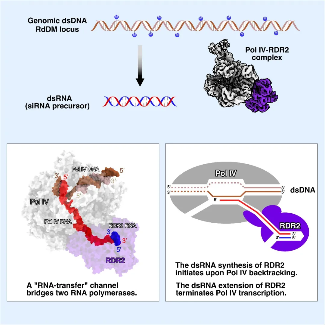 这项工作首次揭示了真核生物第四个多亚基RNA聚合酶的三维构造,阐明了两种RNA聚合酶Pol IV和RDR2协作转录的独特分子机制,回答了RdDM途径中双链RNA如何合成的科学问题。这一研究结果拓展了真核生物RNA聚合酶结构和功能的多样性,加深了我们对植物表观遗传机制的理解。