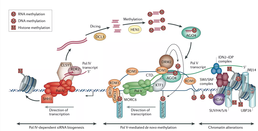 RNA导向的DNA甲基化(RdDM)途径是高等植物基因组甲基化的重要途径。在该途径中,植物独有的两个RNA聚合酶(Pol IV和Pol V)发挥了核心作用。Pol IV与RDR2合作产生小干扰RNA的dsRNA前体,经过加工后形成24个碱基的小干扰RNA,随后这些小干扰RNA在Argonaut蛋白的帮助下与RNA聚合酶Pol V产生的scaffold RNA配对,从而招募DNA甲基转移酶(DRM2)完成DNA的甲基化。