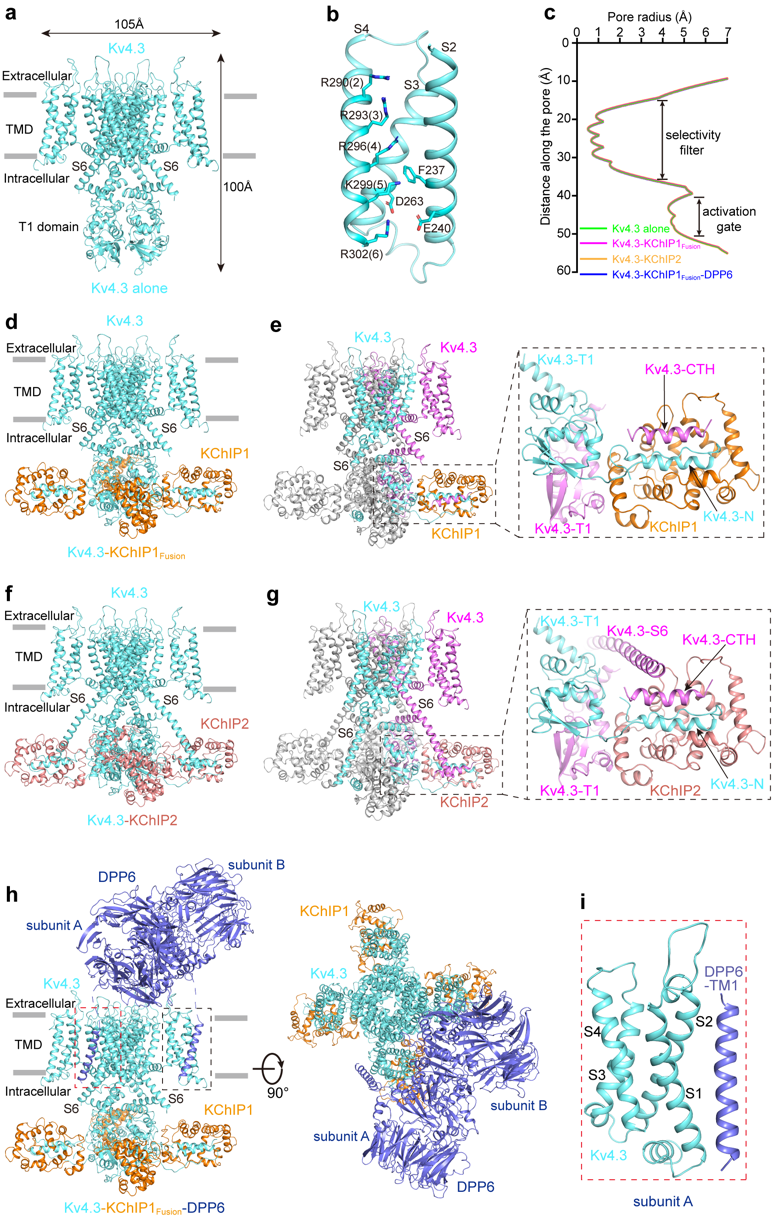 a. Kv4.3结构的侧视图。b. Kv4.3中VSD的结构,为清楚起见省略了S1。c.通过HOLE程序计算出孔的离子传导路径的范德华半径。d. Kv4.3-KChIP1Fusion复合物结构的侧视图。e. Kv4.3与KChIP1之间的相互作用。f. Kv4.3-KChIP2复合物结构的侧视图。g. Kv4.3与KChIP2之间的相互作用。h. Kv4.3-KChIP1Fusion-DPP6复合物结构的侧视图和俯视图。i. DPP6跨膜螺旋与相邻Kv4.3亚基的VSD之间的相互作用。