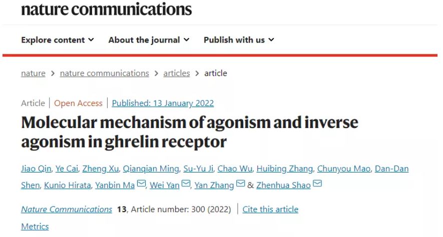 2022年1月13日,437bwin必赢国际官网/良渚实验室张岩课题组与四川大学华西医院邵振华课题组在Nature Communications发表了题为“Molecular mechanism of agonism and inverse agonism in ghrelin receptor”的研究论文, 该成果报道了人源饥饿素受体与反向激动剂PF-05190457结合的晶体结构,以及与内源性配体饥饿素激活受体后结合Go蛋白复合物的冷冻电镜结构,揭示了饥饿素受体识别不同类型配体的分子机制与构象变化,阐释了饥饿素受体激活与反向激动的分子机制。