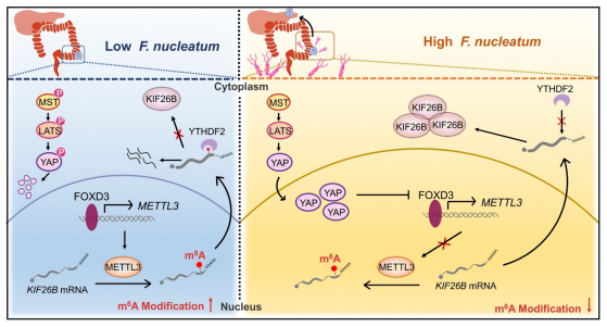 本研究首次阐释了肠道微环境特殊菌群的紊乱可能系统性影响宿主的表观转录组修饰,造成肠癌上皮细胞基因表达调控的异常,促进结直肠癌转移。研究揭示的YAP/FOXD3/METTL3/KIF26B通路介导的肿瘤-菌群互作在促进肠癌细胞转移中发挥重要作用。
