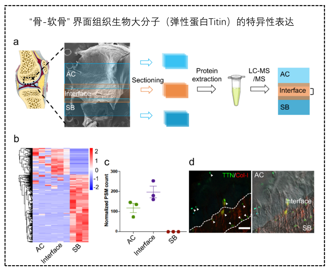此外,我们利用LC-MS/MS对界面处的精确蛋白表达图谱进行检测,发现“骨-软骨”界面组织除了高表达已知的胶原Ⅰ,胶原Ⅱ及一些蛋白聚糖和润滑小分子外,还高表达了弹性蛋白Titin,该分子的存在可以通过可逆形变吸收能量,进而传递应力,有利于维持界面弹性及良好力学传导(图6)。