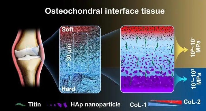 软硬材料界面很容易产生应力集中,导致材料失效。然而,人体中的软硬界面组织具有优异的机械性能,该性能使用合成材料很难复制。其中,人体膝关节的“骨-软骨”界面组织(Osteochondral Interface Tissue),不仅可以实现成分、结构和机械性质完全不同的材料-软骨和硬骨之间的抗疲劳粘附,还可以在每年几百万次循环加载的过程中实现有效力传导而不发生应力集中。