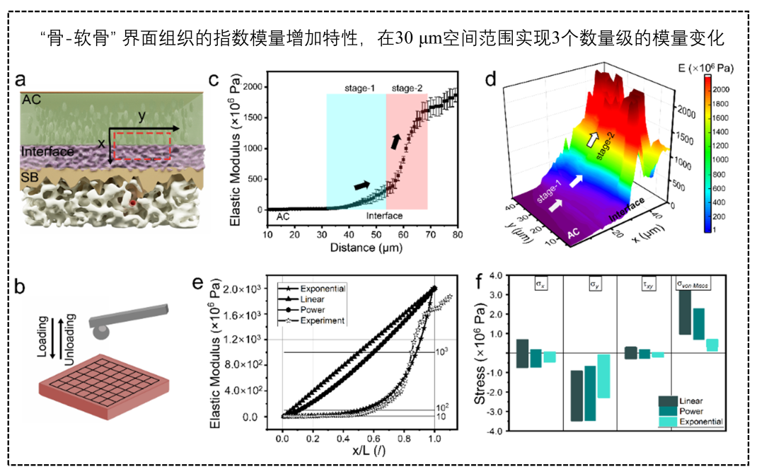 “骨-软骨”界面组织的组织模量图谱呈现两阶段的指数增加特性,并在30 um空间范围内实现3个数量级的增加,有限元分析结果进一步证明该模量转变特性有利于力学传导(图3)。